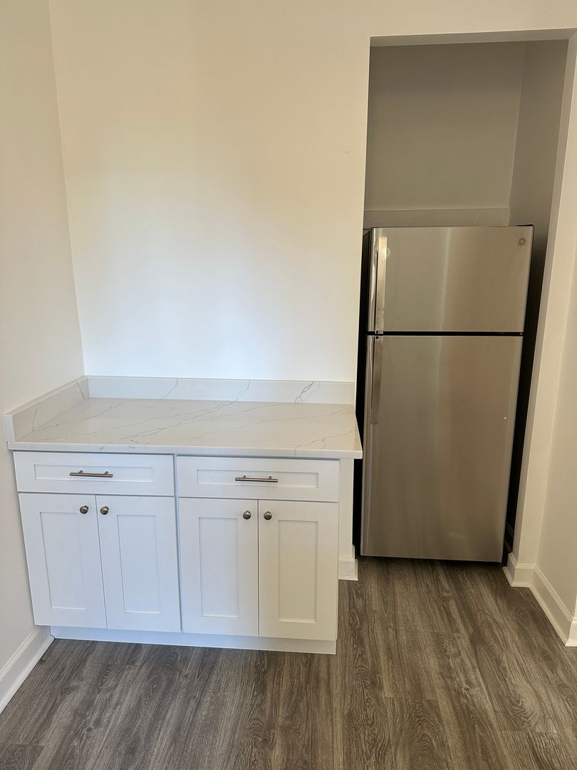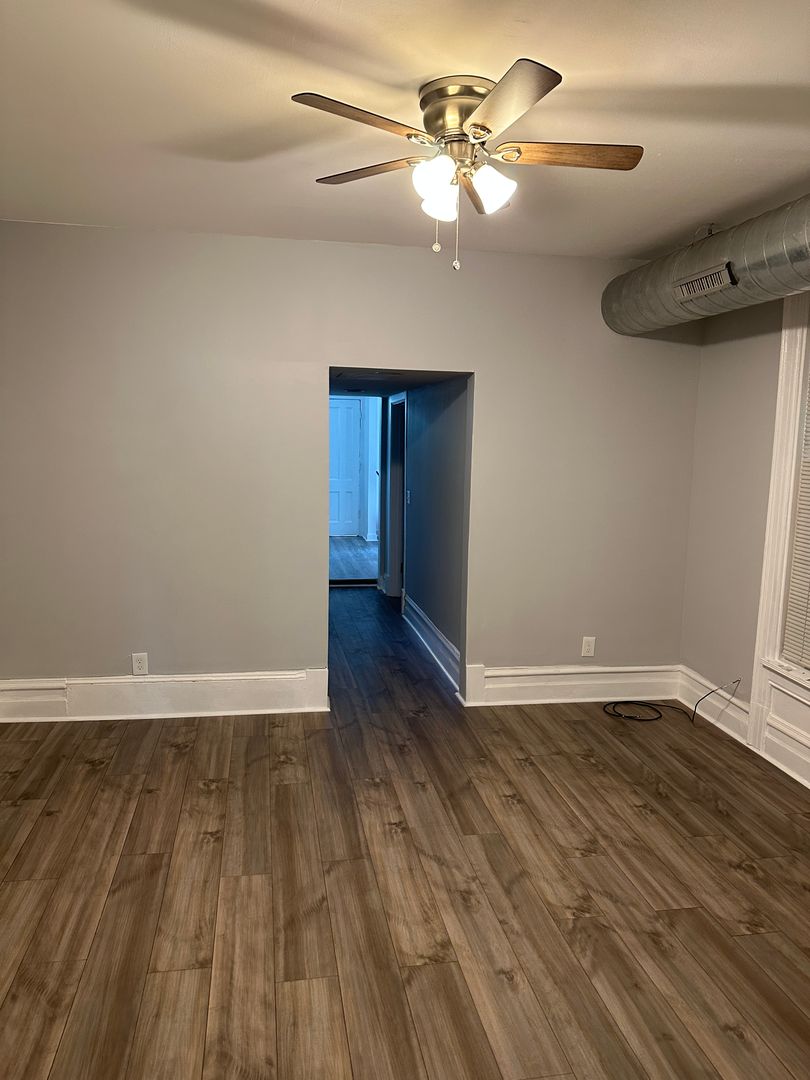 Updated 3-bedroom, 1-bath apartment at 1127 N State St with approximately 1,200 sq ft. Features include luxury vinyl plank flooring, quartz countertops, new kitchen cabinets, recessed lighting, and central heat/AC.